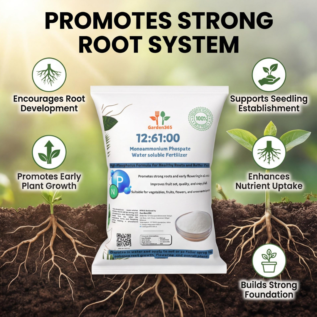 Support early growth, strong roots, and better flowering with 12-61-00 Mono Ammonium Phosphate (MAP) 🌱 – a fully water-soluble fertilizer rich in Phosphorus (61%) and Ammoniacal Nitrogen (12%). Ideal for vegetables, fruits, flowers, hydroponics, and nursery plants, MAP promotes rapid root establishment, enhances flower initiation, and improves crop quality. 🌸🥦🍇🥭
